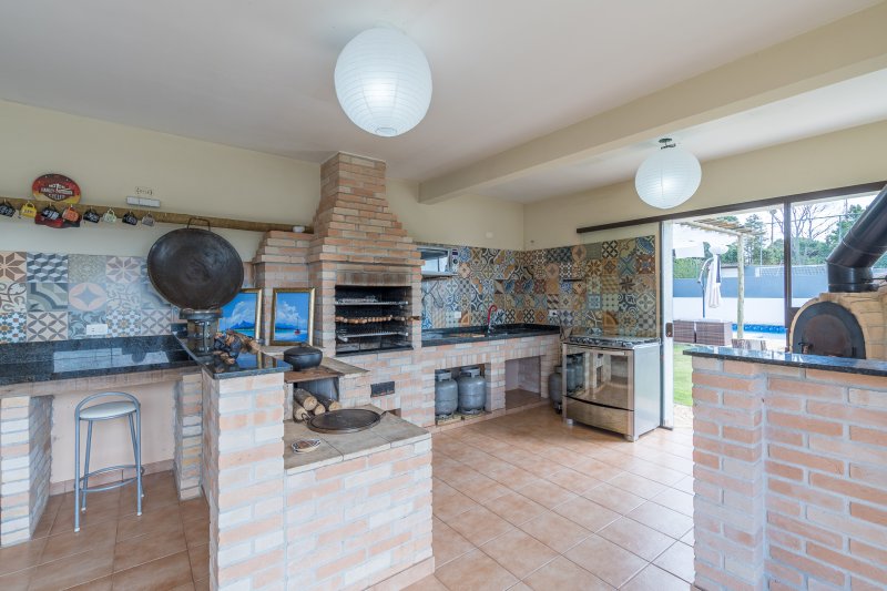 Area gourmet com churrasqueira, forno pizza, fogão a lenha e cozinha